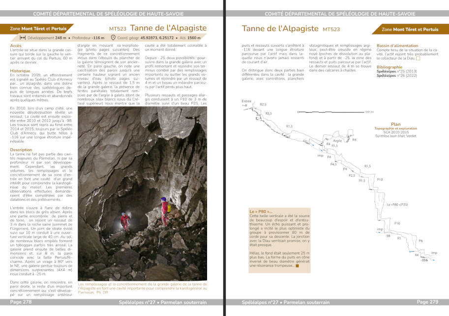 Par la diffusion de leurs travaux, les spéléologues contribuent à accroître la connaissance de notre environnement, dans ses dimensions historiques, géologiques & hydrologiques, biologiques ou environnementales. Le comité départemental est acteur de la publication de ces travaux, notamment au travers d'une revue spécialisée : Spéléalpes. Cette publication relate notamment les nouvelles explorations et découvertes souterraines. Elle parait de manière épisodique depuis 1977. Sur cette page est présenté le numéro spécial n°27 dédié au Parmelan.